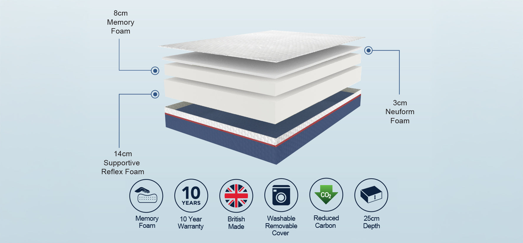 At the core is 14cm of supportive reflex foam, providing a solid and durable base. This is complemented by an 8cm layer of memory foam that gently contours to the body, helping to relieve pressure points and promote comfortable alignment. A further 3cm layer of Neufrom foam enhances comfort and responsiveness, creating a smooth and supportive sleep surface. With an overall depth of 25cm, the mattress offers a substantial and premium feel.
